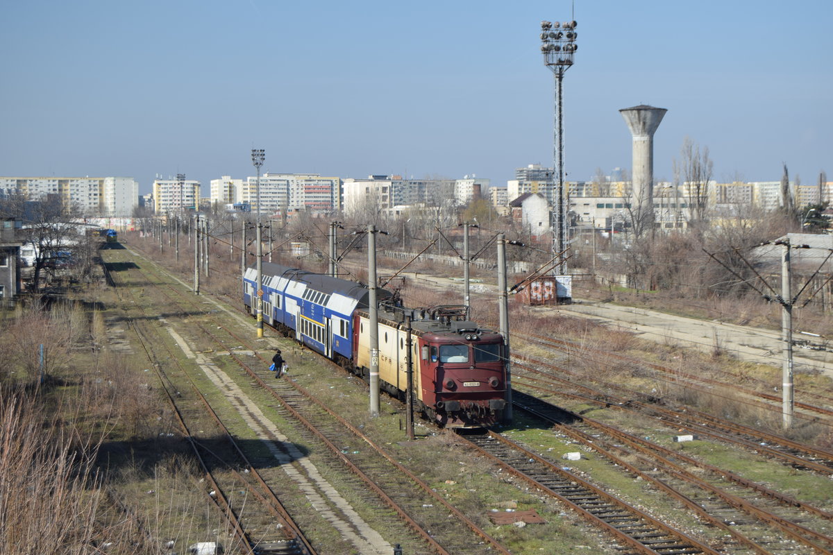E-Lok 41-0145-7 mit Doppelstockwagengarnitur kurz nach der Abfahrt aus dem bukarester Nordbahnhof am 26.02.2017