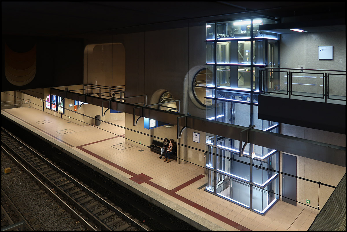 In frischem Glanz - Die U-Haltestelle Maybachstraße in Stuttgart-Feuerbach aus dem Jahr 1984 wurde vor kurzem brandschutztechnisch saniert und außerdem barrierefrei zugänglich gemacht. Die bestehende Architektur wurde dabei beibehalten und erhielt durch die Aufzugsgestaltung einen interessanten Licht-Akzent. Wo anders werden Galerien sogar zugemauert, wenn der Brandschutz eine Abtrennung erforderlich macht. Hier wurde mit viel Glas gearbeitet. Mit diesem Bild wollte ich mal die Untergrund-Tauglichkeit der neuen Kompakt-Kamera ausprobieren. 27.02.2017 (M)