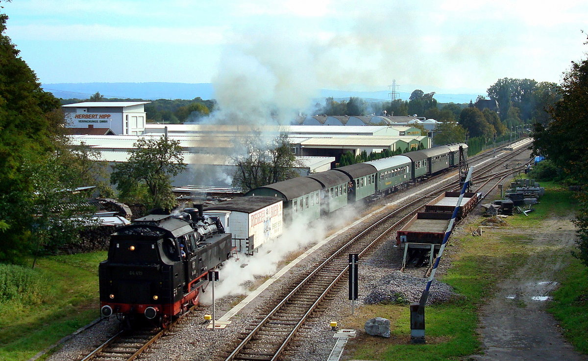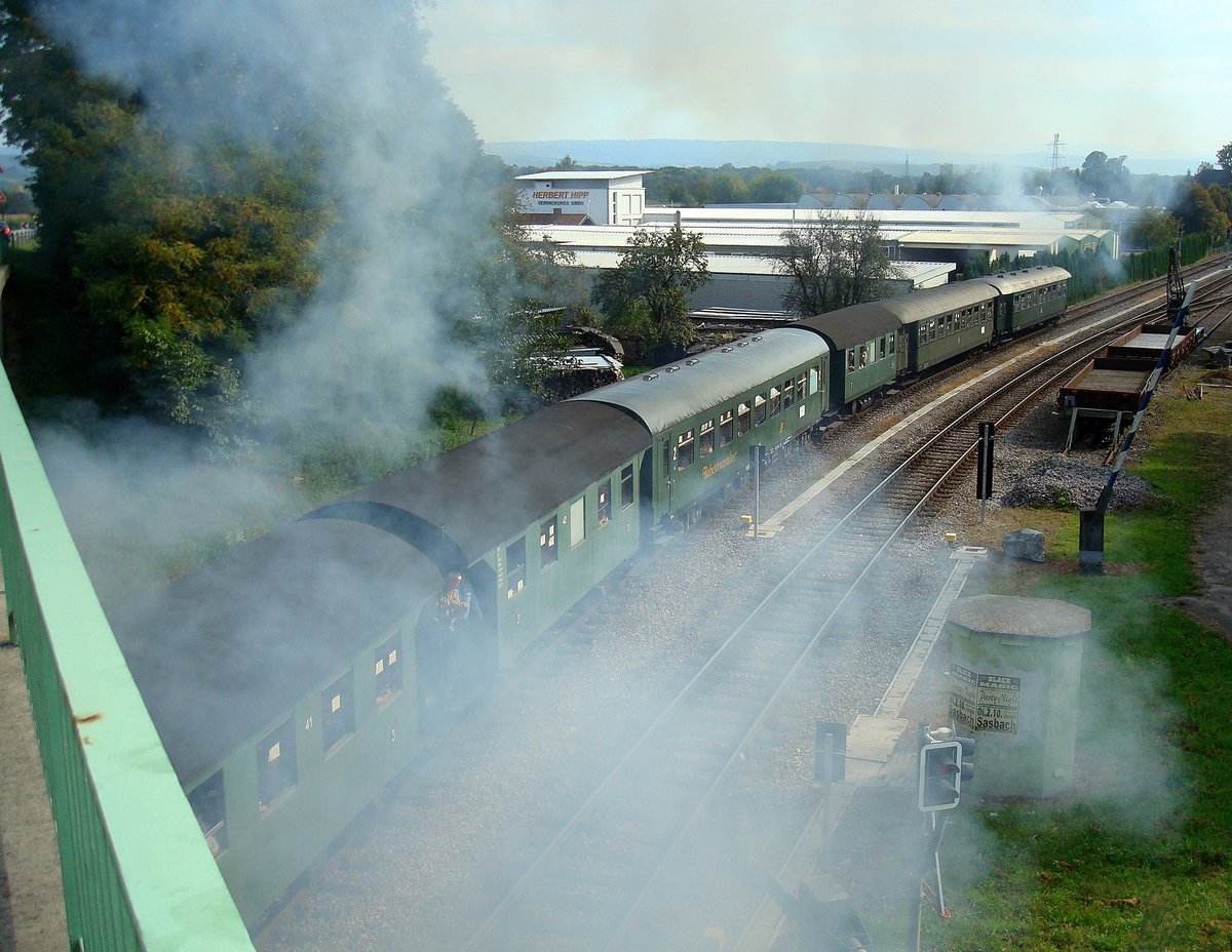 Museumszug  Rebenbummler  unterquert nach Verlassen des Bahnhofs Riegel a.K. die Straßenbrücke der L116, Okt.2007