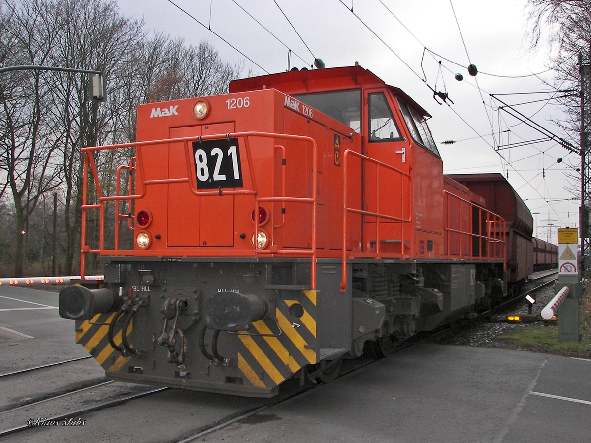 RBH821 am 24.03.2007 im ehemaligen Übergabebahnhof Recklinghausen-Hochlarmark. Die Vossloh G1206, NVR.-Nr.:92 80 1275 001-6 D-DISPO, war von 2005 - 2014 für die RAG/RBH unterwegs, seit 1.6.2016 im Dienst für Chemion Logistik.