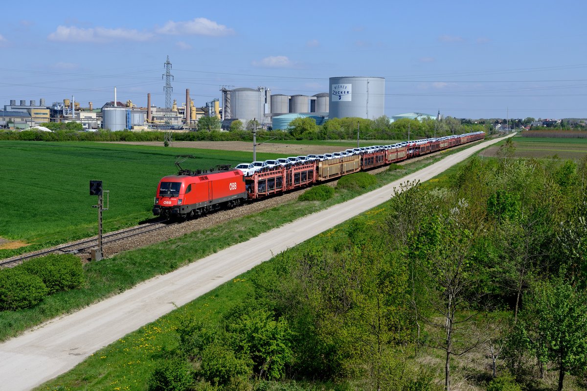 Vom beschaulichen Waldviertel ins Tullnerfeld: Ich habe ein Faible für Bilder mit Industrieanlagen und bei Tulln gibt es die Möglichkeit, Bilder mit den beeindruckenden Anlagen der Zuckerfabrik der Agrana im Hintergrund anzufertigen. Ich musste nicht lange warten und 1116.064 kam mit einem langen Autotransportzug - beladen mit Fahrzeugen des Typs Skoda Octavia - an meinem Standpunkt vorbeigefahren. Bei dem abgebildeten Zug handelte es sich vermutlich um den SGAG 49419 von Týniště nad Orlicí nach Koper Luka - einem Semmeringumleiter.