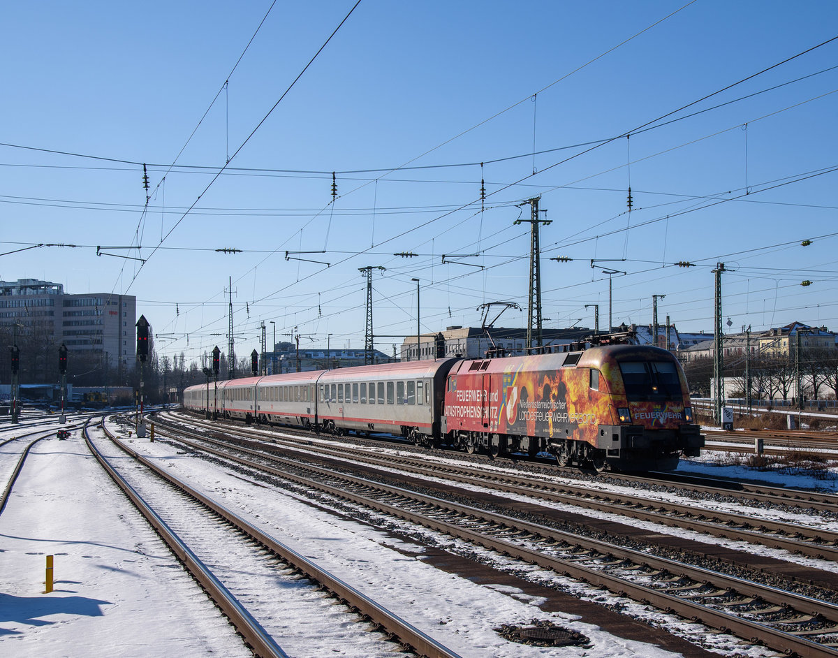 1016 048 Niederösterreichischer Landesfeuerwehrverband mit EC 113 bei der Einfahrt von München-Ostbahnhof am 29.1.2017.