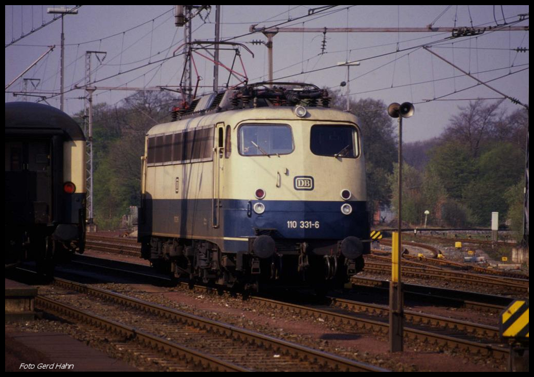110331 rangierte am 7.4.1990 um 11.10 Uhr im Grenzbahnhof zu den Niederlanden in Bad Bentheim.