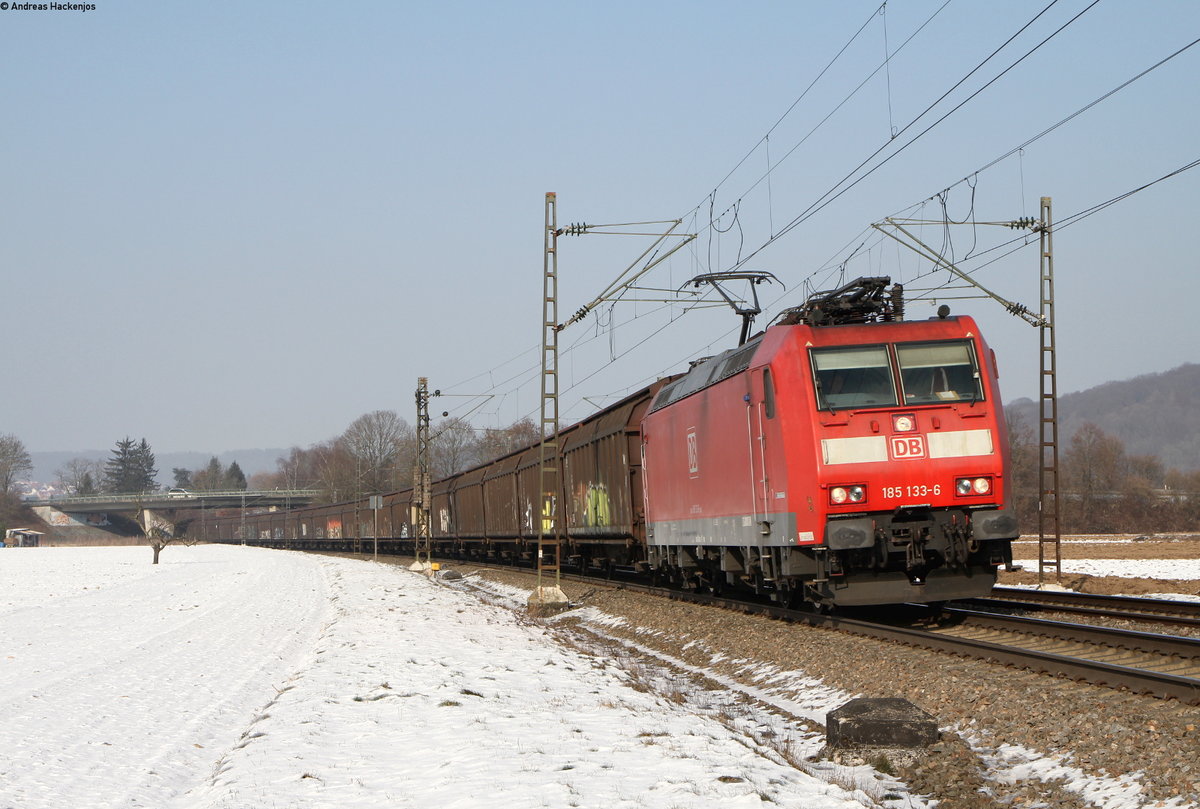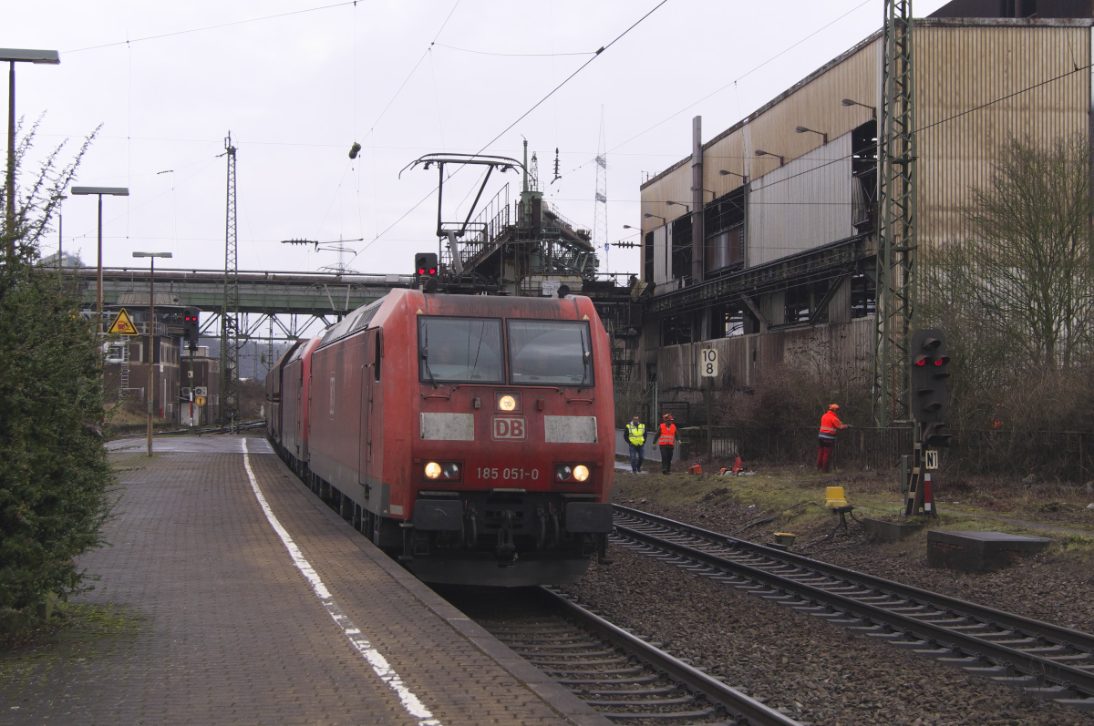185 051 leistet Vorspann, dahinter eine weitere 185er und am Schluss noch Schubunterstützung durch eine weitere 185er. Der Kohlenzug wird wohl zum Anschluss Göttelborn/Kraftwerk Weiher unterwegs sein. 03.02.2017 Bahnstrecke 3230 in Völklingen.