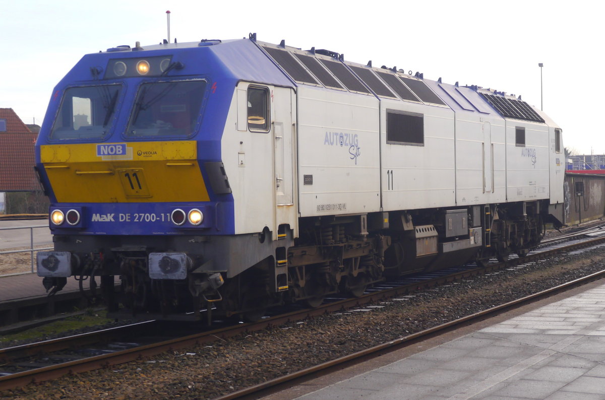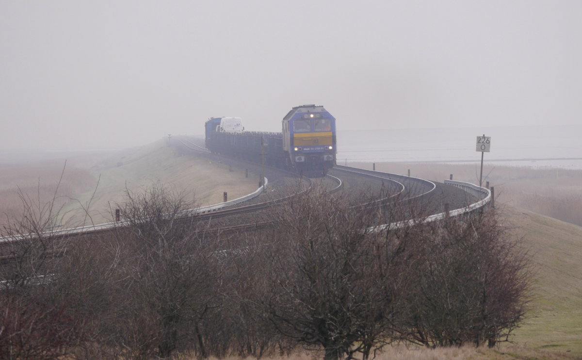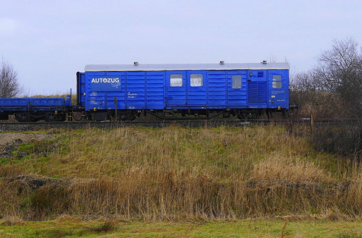 Am Schluss der RDC-Autozüge (bei Fahrtrichtung Sylt) läuft ein Begleitwagen, aufgenommen nahe Bf Keitum, 24.1.17.