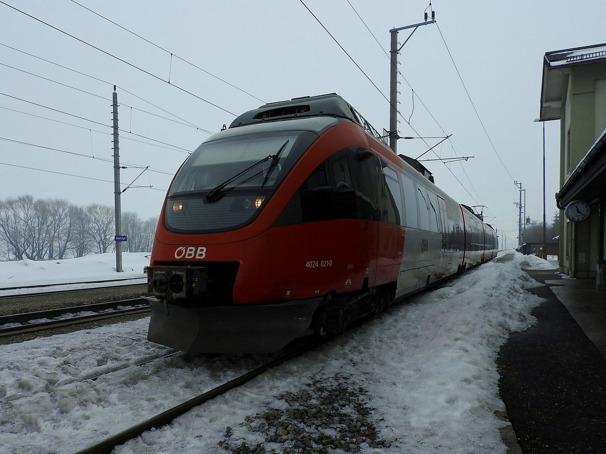 4024 129-1 verlässt als REX3006 den verschneiten Bahnhof Redl-Zipf; 170204