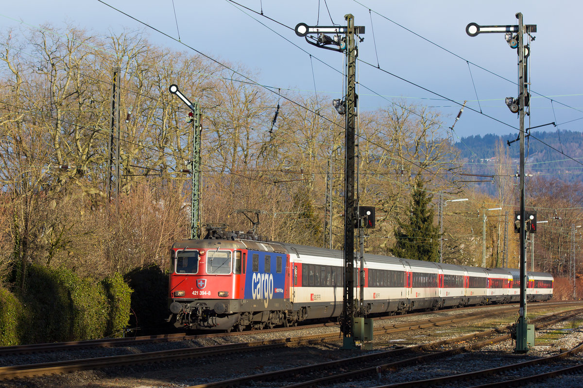 Re 421 389-8 wartet beim Güterbahnhof Muttenz auf den nächsten Einsatz. Die Aufnahme stammt vom 06.02.2017.