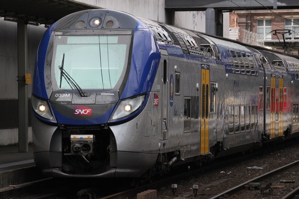 Die Rhein Niers Bahn (RB33) kommt die Kohlscheider-Rampe hoch aus Duisburg-Hbf nach Aachen-Hbf und hält in Kohlscheid und fährt in Richtung Richterich,Laurensberg,Aachen-West,Aachen-Schanz,Aachen-Hbf. Aufgenommen von Bahnsteig 2 in Kohlscheid. Bei Wolken am Kalten Nachmittag vom 1.2.2017.