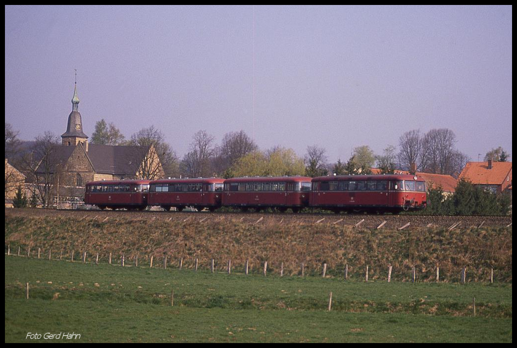 Am 7.4.1990 befuhr eine vierteilige Schienenbus Garnitur mit Motorwagen 796901 voraus der Eisenbahnfreunde Seelze den Haller Willem. Um 10.03 Uhr kam er auf dem Weg nach Osnabrück hier durch Kloster Oesede.
