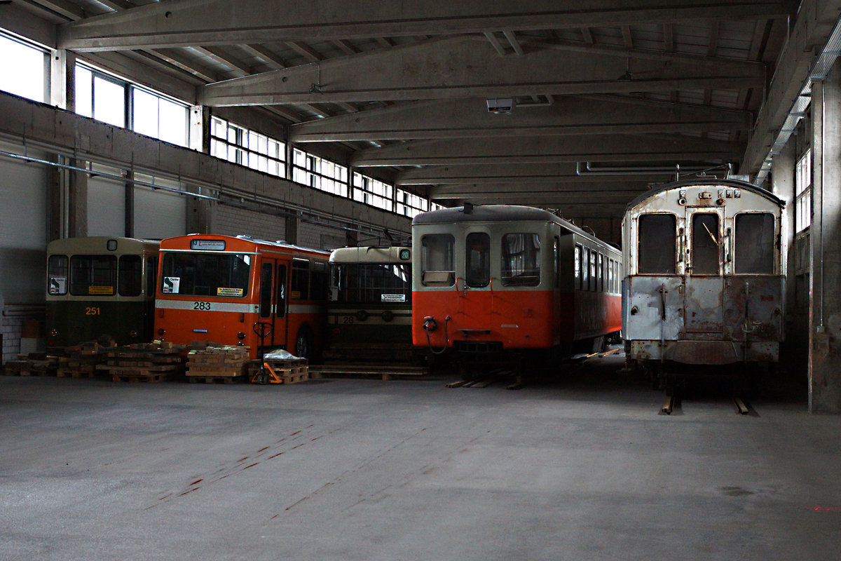Familienfoto der in der Lagerhalle Aarberg abgestellten Museumsfahrzeuge. Dies sind: BCFe 4/4 16, Baujahr 1905, Bt 222, Baujahr 1954, Trolleybus 28, Dieselbus 283 und Dieselbus 251.