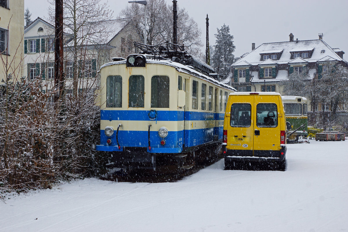Besichtigung des Trammuseums Bern vom 5. Februar 2017. Drei Bahnfreunde aus den Kantonen Solothurn, Zürich und Thurgau besuchten unter der fachkundigen Führung von Bernhard Graser die gegenwärtigen Standorte Bern Weissenbühl, Bern Burgernziel und Aarberg. Der in der Lagerhalle Aarberg abgestellte ehemalige MOB Motorwagen BCFe 4/4 16, Baujahr 1905, verbleibt in der Sammlung des Tramvereins Bern. Die am 2. Februar 2017 eingestellte Aufnahme zeigt in noch im Betriebszustand in Château-d'Oex. Foto: Walter Ruetsch