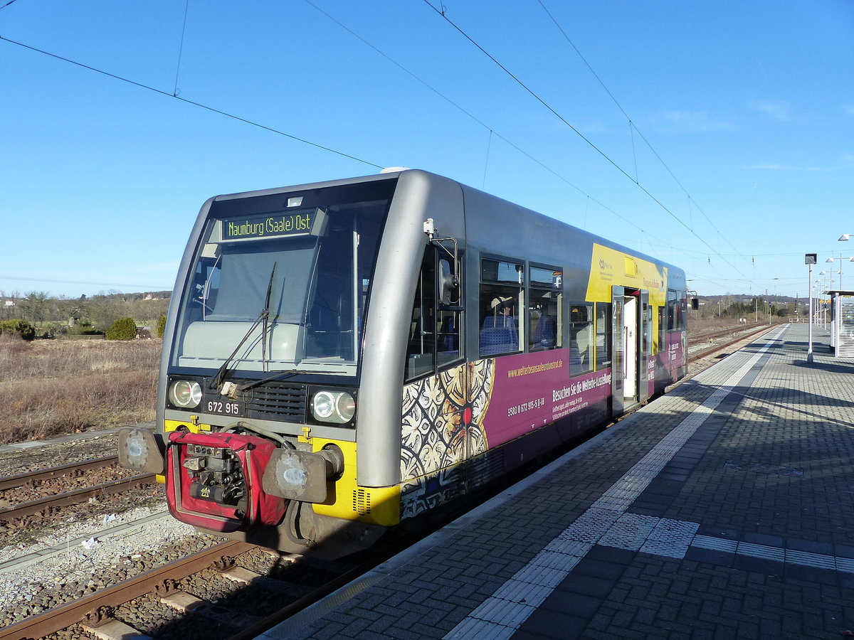 Burgenlandbahn 672 915, mit Werbung für den Förderverein Welterbe an Saale und Unstrut e.V., als RB 26879 von Wangen (U) nach Naumburg (S) Ost, am 04.02.2017 in Naumburg (S) Hbf.