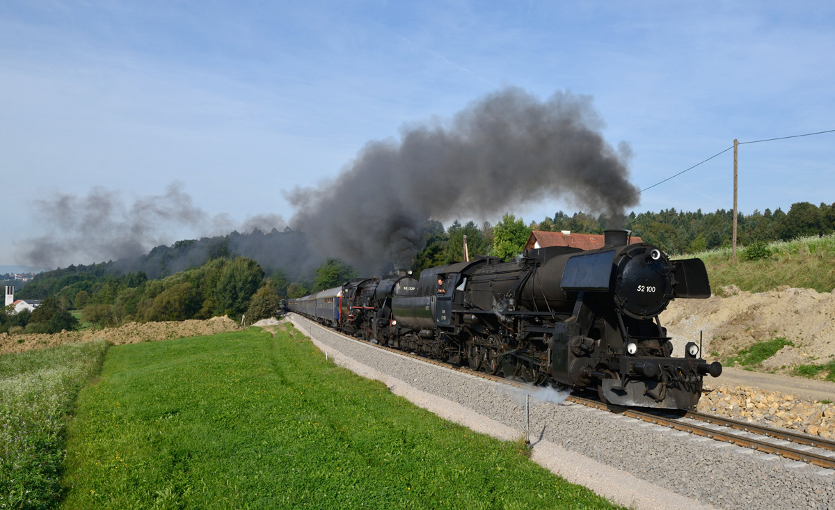 2016 078-6 startet mit einer Rußfahne bzw. Diesel-Rauchschwade, sowie mit 47850 am Haken aus dem Bhf. Ried; 170203
