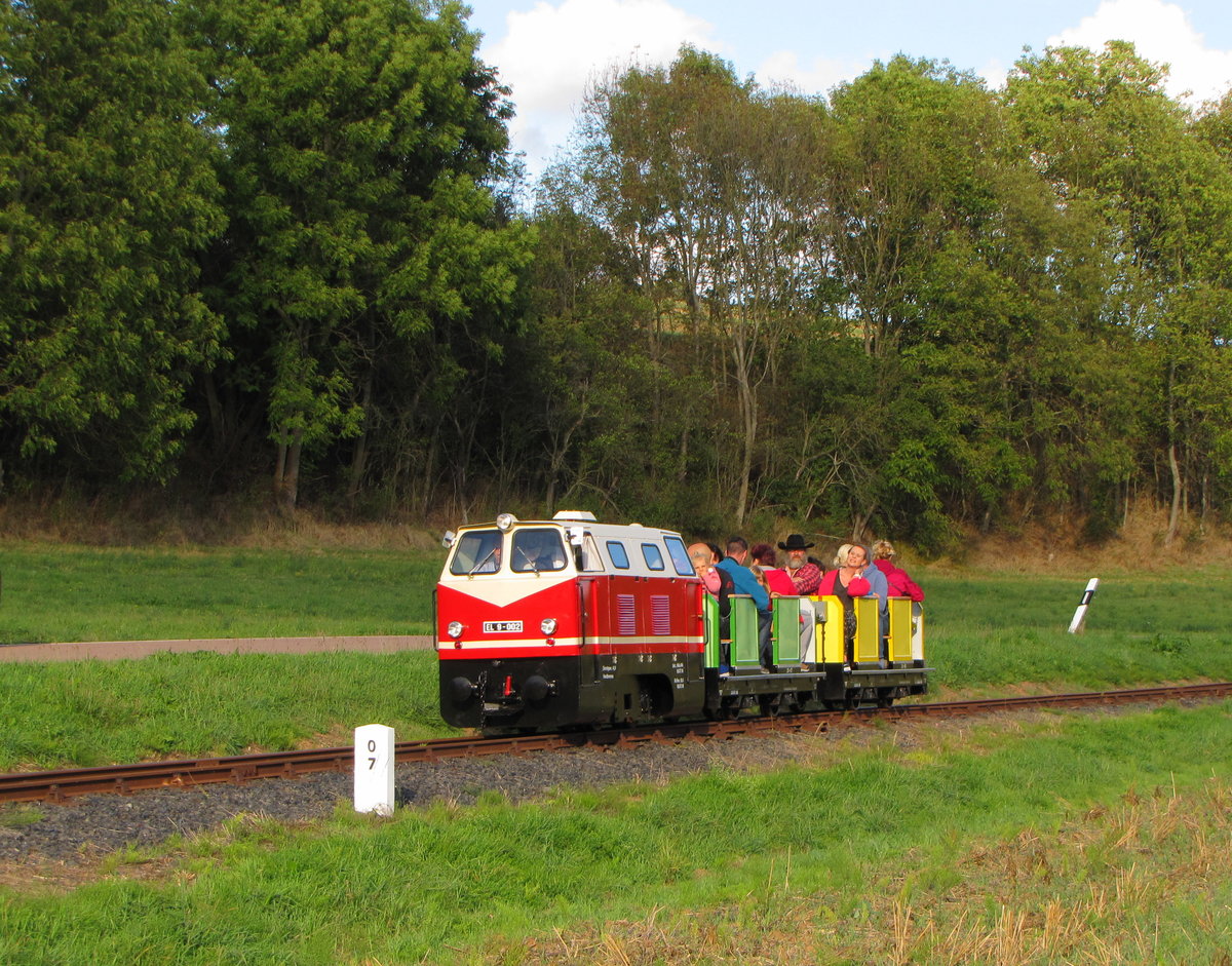 Die EL 9-002 der Parkeisenbahn Vatterode am 02.10.2016 mit einem Zug zwischen den Bahnhöfen Wippergrund und Mansfeld Schleife.