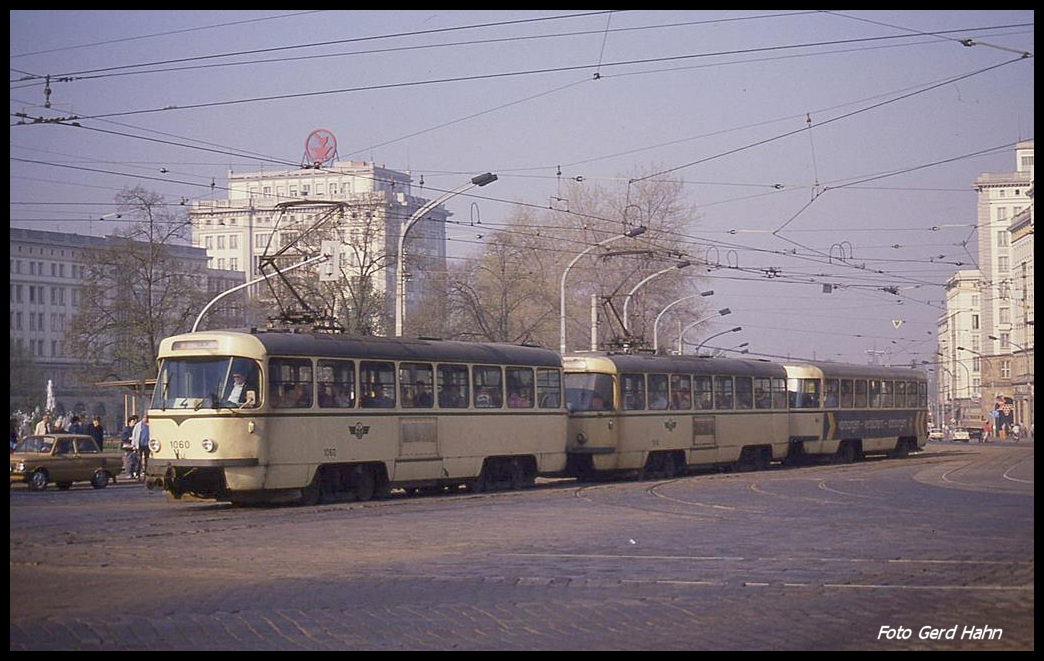 Dreiteiliger Tatra Zug am 2.4.1990 mit Motorwagen 1060 voraus auf der Linie 4 in Magdeburg unterwegs auf der Karl Marx Straße.