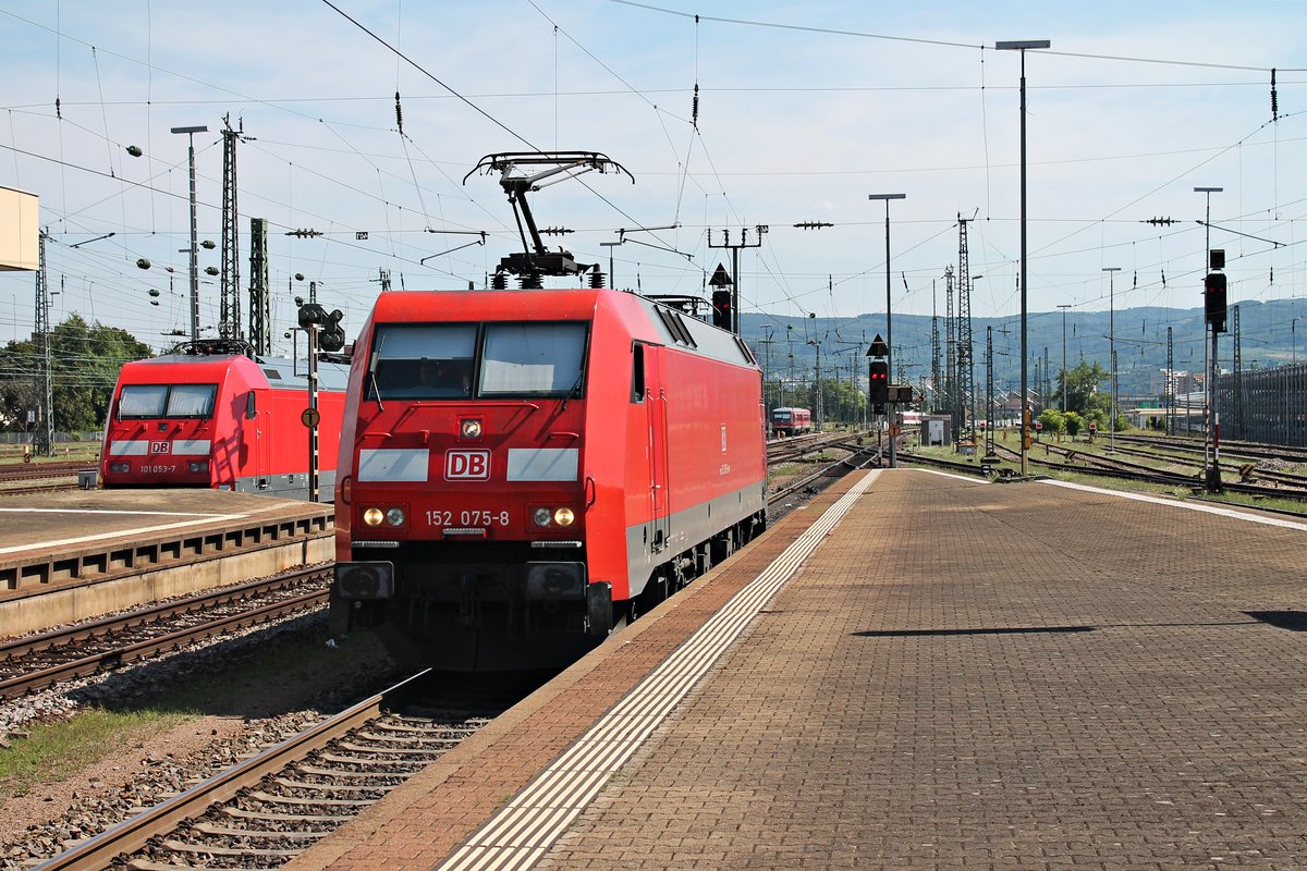 Druchfahrt am 06.08.2015 von der Nürnberger 152 075-8 als Lokzug durch den Badischen Bahnhof von Basel in Richtung Weil am Rhein/BW Haltingen. Zuvor brachte sie einen Güterzug in den Rangierbahnhof Muttenz.