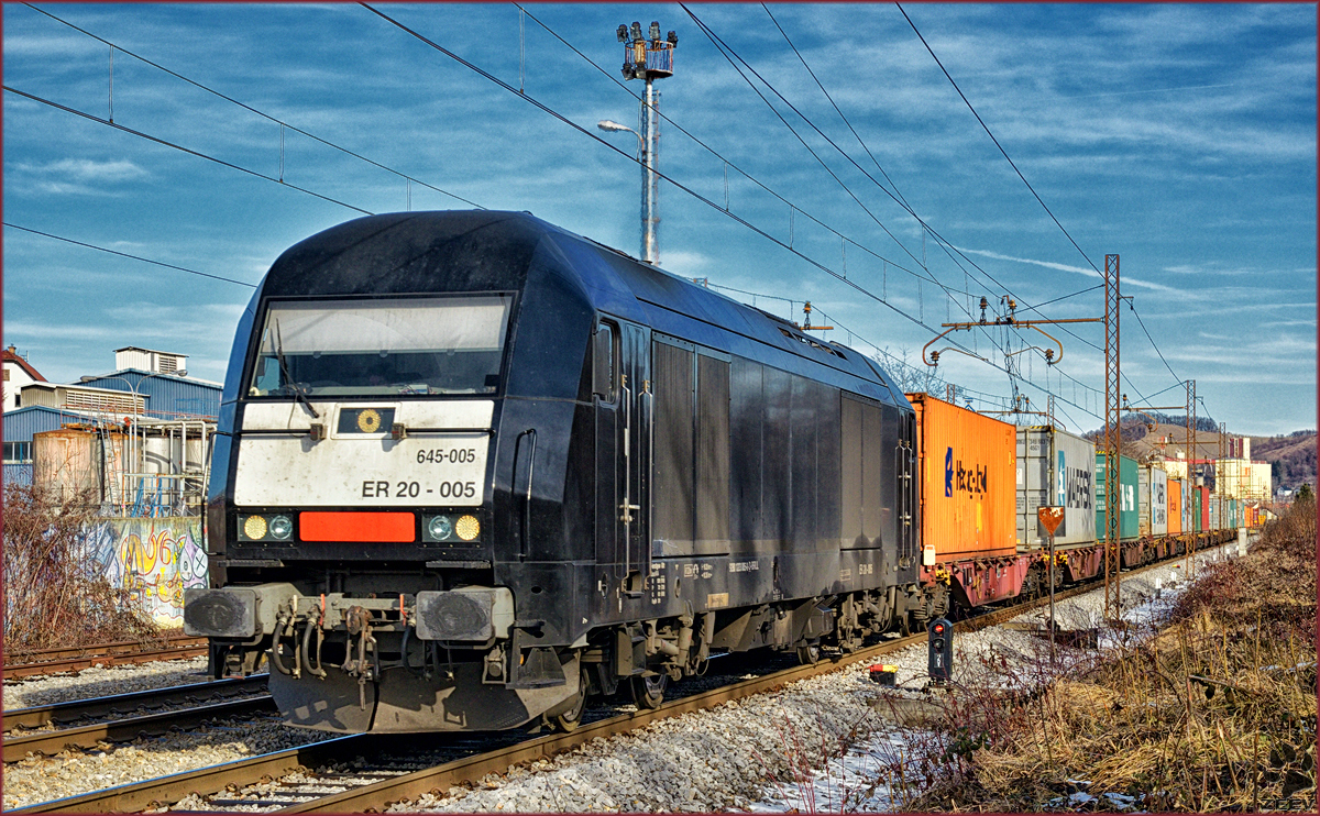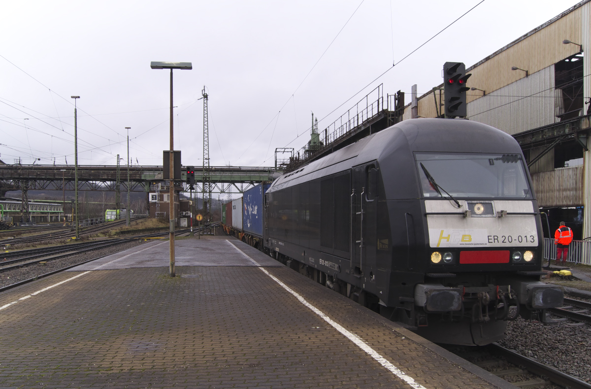 ER 20-013 / 223 013-4 rauscht mit einem Containerzug durch Völklingen Saar. Die Dispolok ist zur Zeit an die HGB (Hessische Güterbahn) vermietet. Bahnstrecke 3230 am 03.02.2017