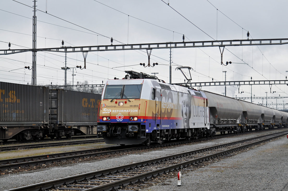 Lok 185 589-9, mit einer Werbung für die 500 Jahre Reformation von Martin Luther, durchfährt den Güterbahnhof Muttenz. Die Aufnahme stammt vom 06.02.2017.