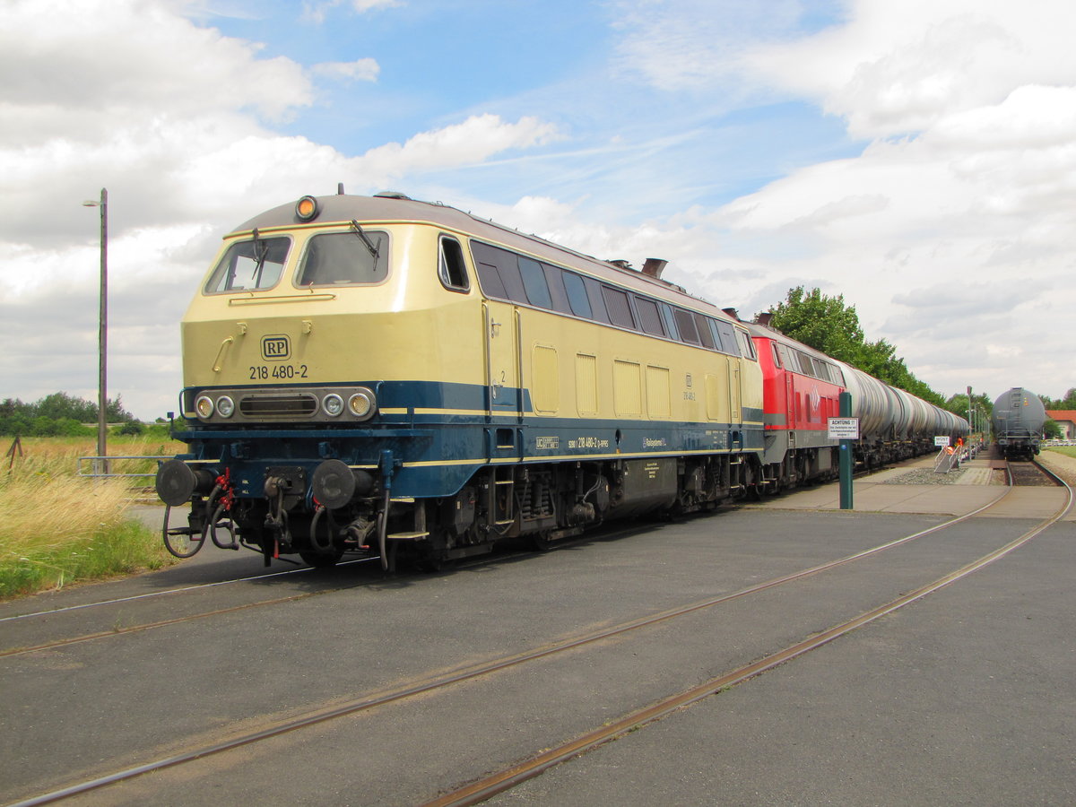 Railsystems RP 218 480-2 + 218 469-5 mit einem Kesselwagezug, am 11.07.2016 im UNI-Tanklager Emleben.