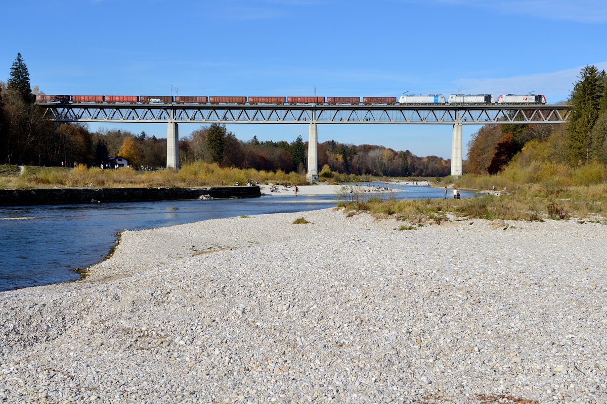 Schon länger auf meiner Wunschliste stand der sonntags über die Mangfalltalbahn verkehrende DGS 44125 von München Nord nach Brescia bei der Überquerung der Isar auf der Grosshesseloher Brücke. Am 08. November 2015 wurde der ungewöhnlich warme Tag für einen Abstecher nach Geiselgastieg genutzt und der Zug abgewartet. Zu meiner Freude war er mit drei Loks bespannt: 185 665, 186 443 und 288 gaben sich an diesem Tag die Ehre.