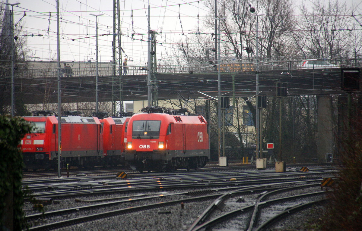 Taurus ÖBB 1116 050 von ÖBB kommt von einer Schubhilfe aus Richtung Gemmenicher-Tunnel zurück nach Aachen-West und fährt in Aachen-West ein. Aufgenommen von Bahnsteig in Aachen-West. Bei Regenwetter am Kalten Nachmittag vom 30.1.2017.