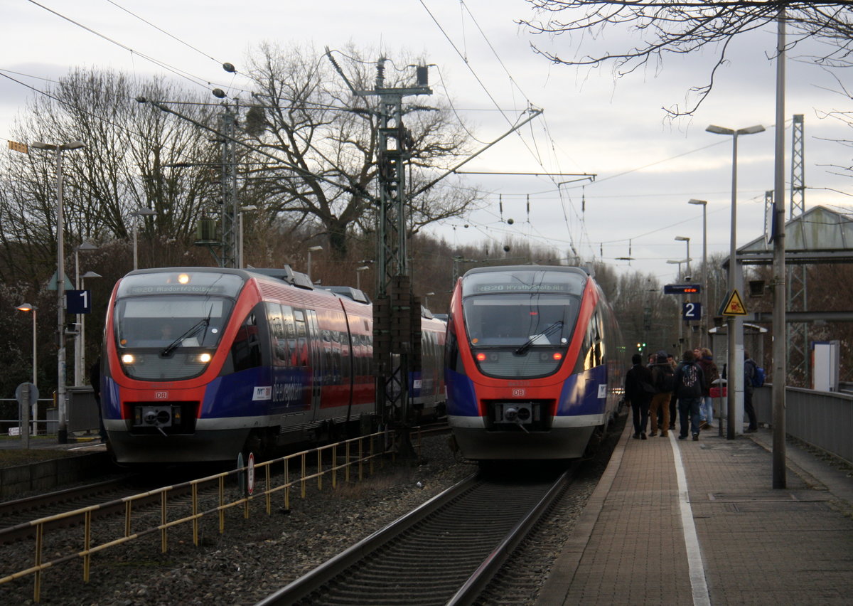 Zwei Euregiobahn (RB20) begegnen sich im Bahnhof Kohlscheid. Aufgenommen von Bahnsteig 2 in Kohlscheid. Bei Wolken am Kalten Nachmittag vom 1.2.2017.