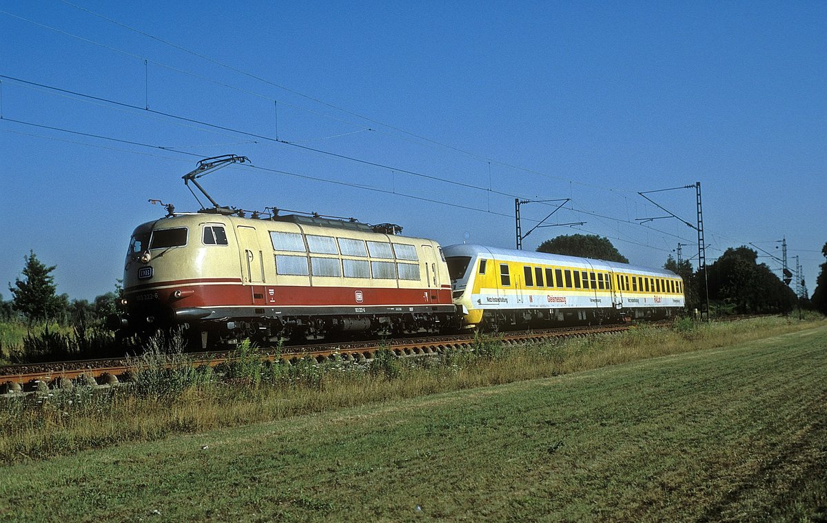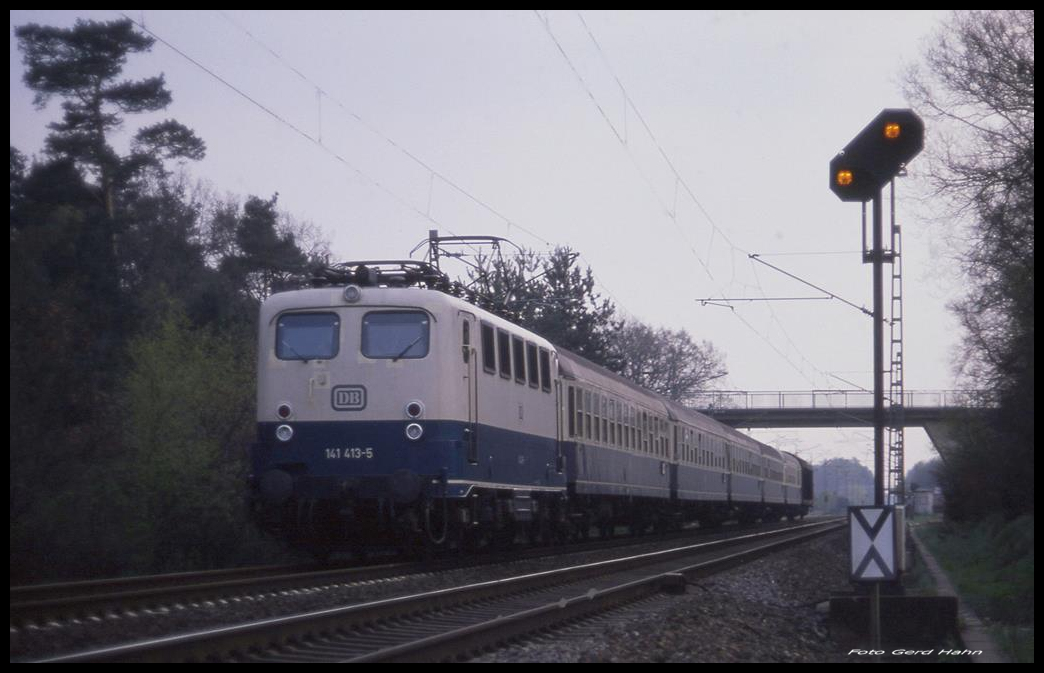 141413 mit E 3138 bei Haßbergen, Kreis Nienburg, am 22.4.1990 um 15.10 Uhr unterwegs nach Bremen.