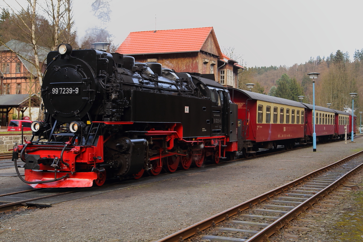 99 7239 mit P8965 (Gernrode-Hasselfelde) am Nachmittag des 07.02.2016 im Bahnhof Alexisbad.