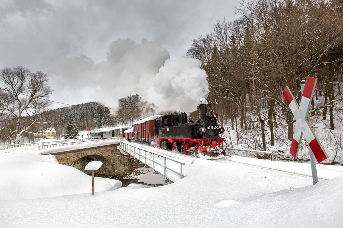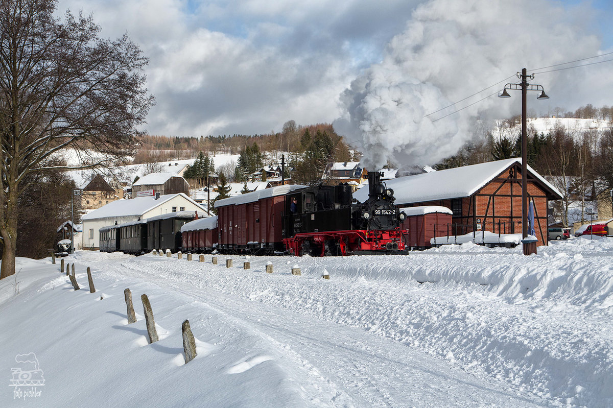 99.1542 fährt von Wolkenstein kommend in den Bahnhof Steinbach ein. 15.1.2017