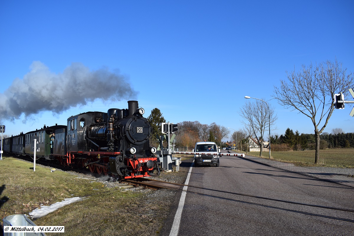 Der Personenzug hat am 04.02.2017 Benndorf fast erreicht und befindet sich nun kurz vor der Straßendurchfahrt in Klostermansfeld.