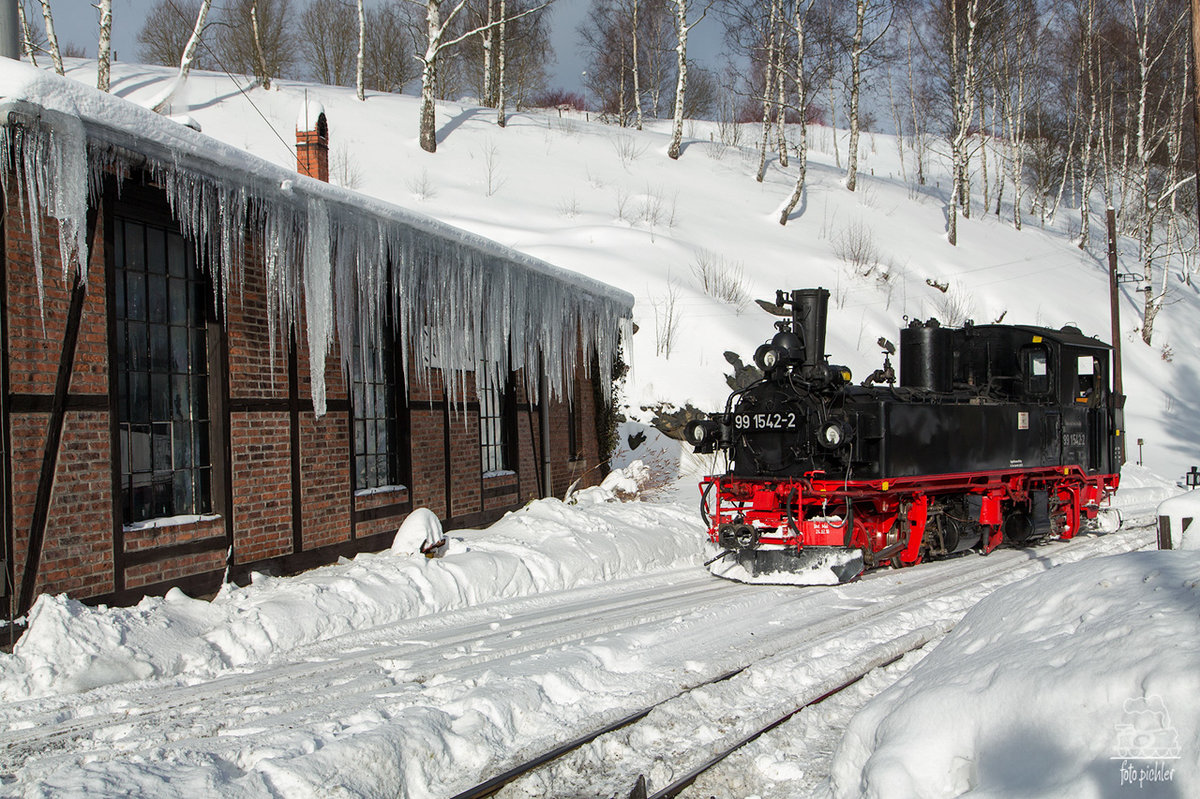 Im Bahnhof Jöhstadt hängen dicke große Eiszapfen vom Lokschuppen. 15.1.2017
