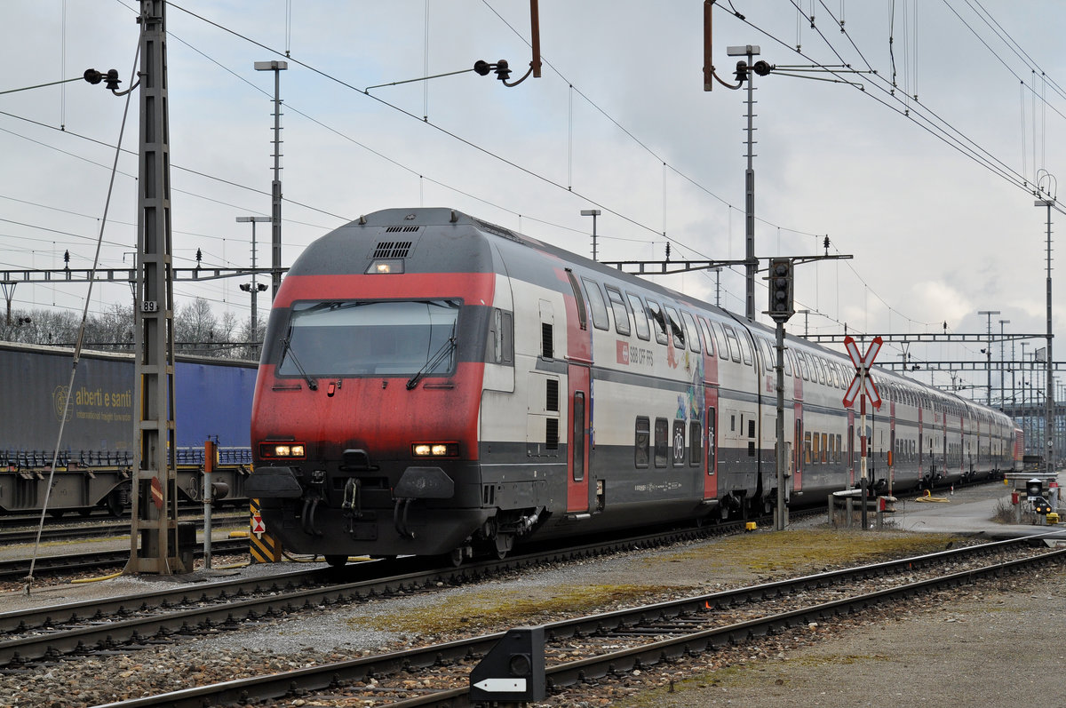 Nach einem Ereignis im Bahnhof Muttenz werden alle Züge durch den Güterbahnhof Muttenz umgeleitet. Hier durchfährt ein IC 2000 Doppelstockzug den Güterbahnhof. Die Aufnahme stammt vom 06.02.2017.