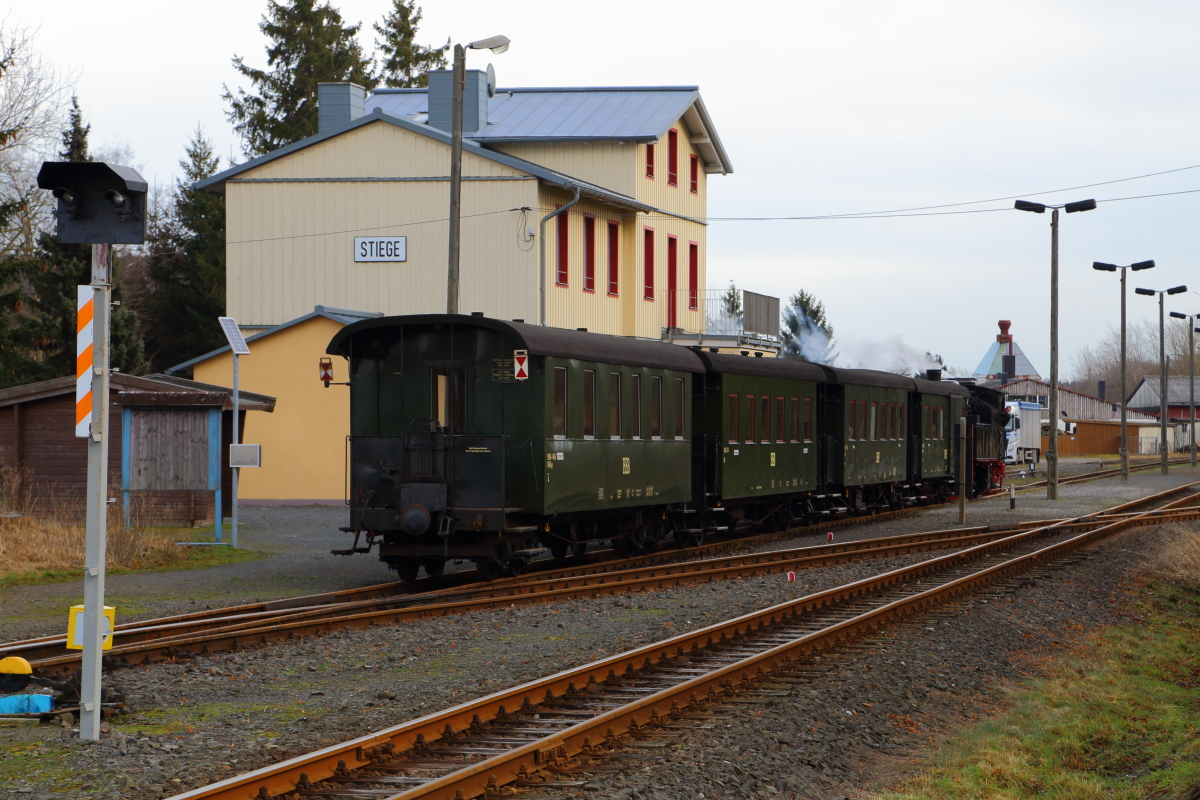 Nachdem er am 07.02.2016 die Wendeschleife in Stiege durchfahren hat, steht der IG HSB-Sonderzug, mit 99 5901 an der Spitze, wieder im Bahnhof, um die Fotografen einsteigen zu lassen. Danach wird die Fahrt in Richtung Quedlinburg fortgesetzt.