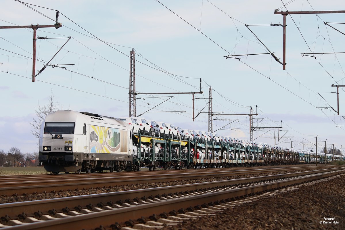 PCT 223 155 mit einem Autotransportzug in Dedensen Gümmer, am 04.02.2017.