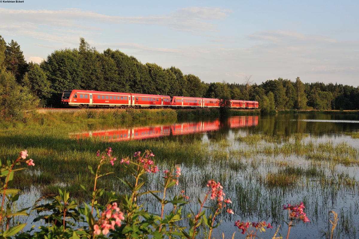Zum Wochenende hin fahren die RE-Züge zwischen Regensburg und Hof oft verstärkt als Dreiergarnitur, so auch am 28.07.2016 als sich RE3698 bei Wiesau zeigte.