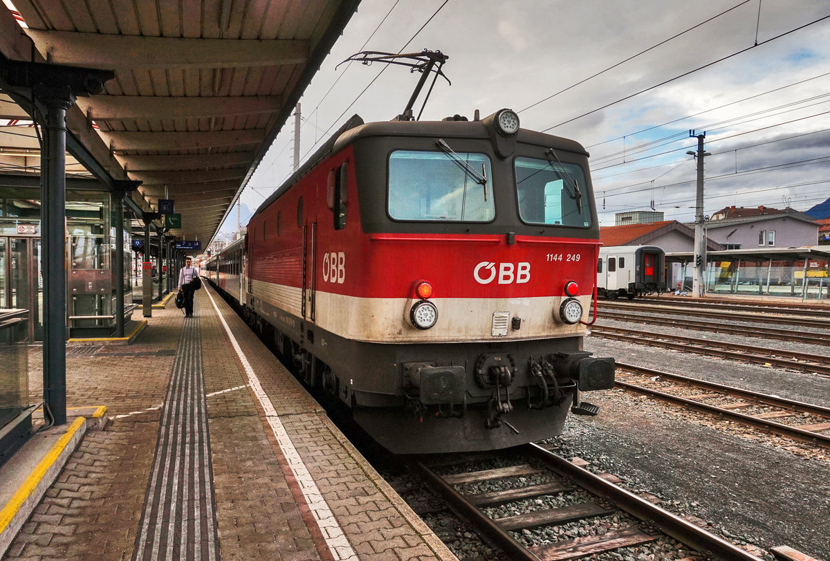 1144 249-0 wartet in Villach Hbf, mit dem D 735 nach Lienz, auf den verspäteten railjet 537 aus Wien Hbf.