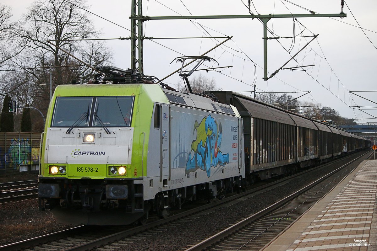 185013 kam am 7.2.2017 um 12.55 Uhr in Richtung Osnabrück fahrend mit einem langen Röhrenzug am Haken durch den Bahnhof Hasbergen.
