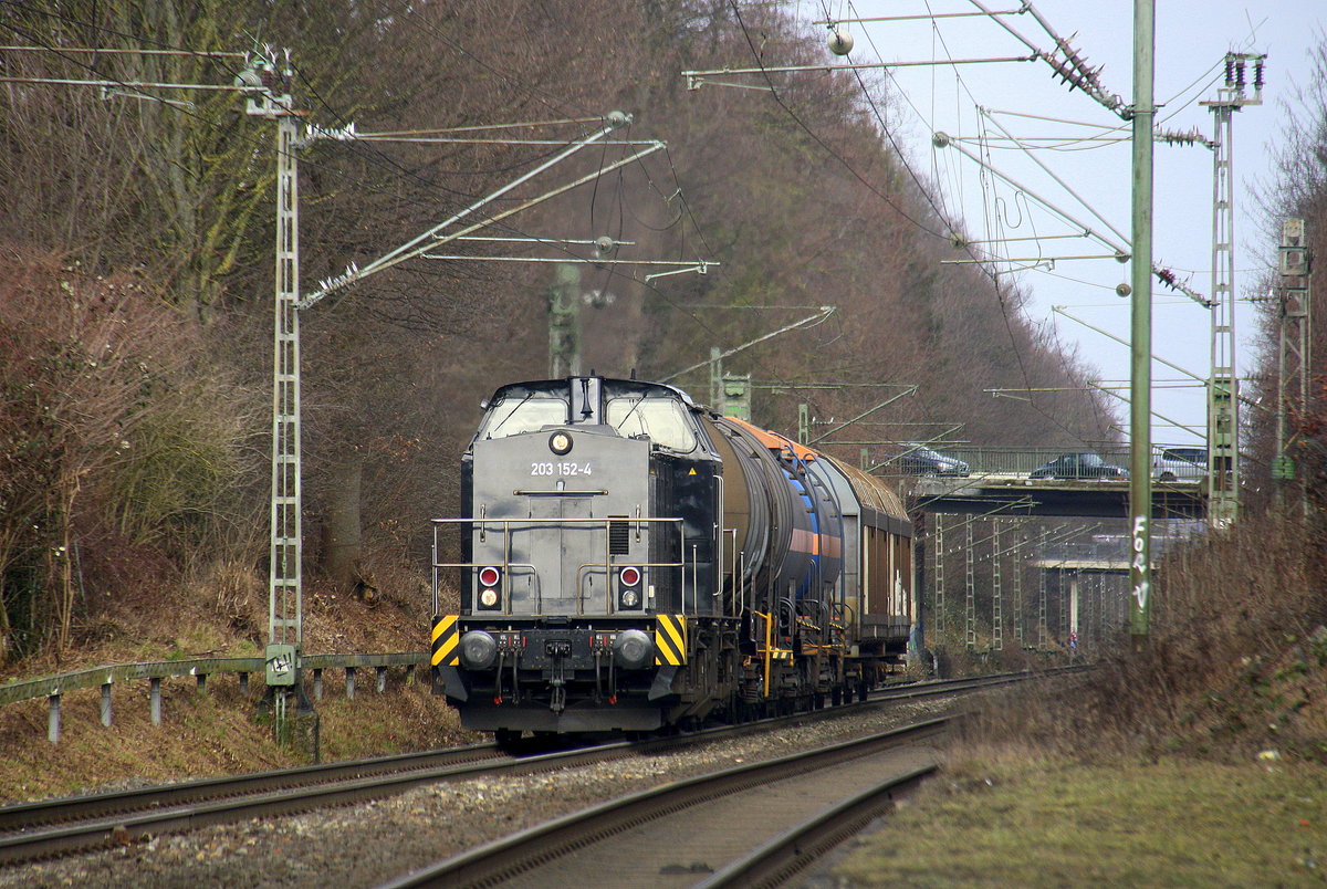203 152-4 "Felix" kommt die Kohlscheider-Rampe hoch aus Richtung Neuss,Herzogenrath mit einem Kurzen Güterzug aus Duisburg nach Aachen-West nd fährt durch Kohlscheid in Richtung Richterich,Laurensberg,Aachen-West. Aufgenommen vom Bahnsteig 1 in Kohlscheid. Bei Sonnenschein am Kalten Mittag vom 2.2.2017.