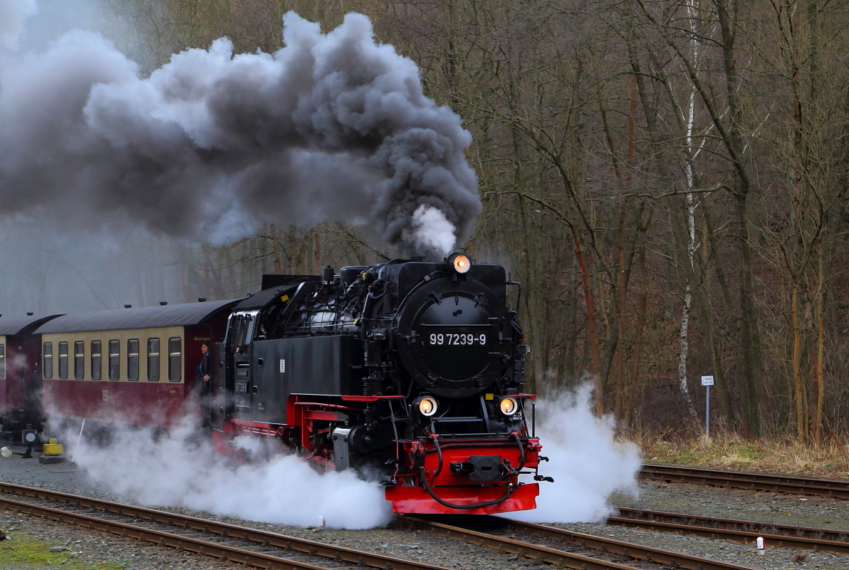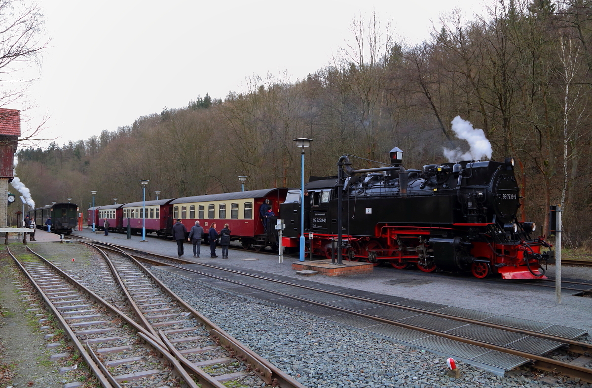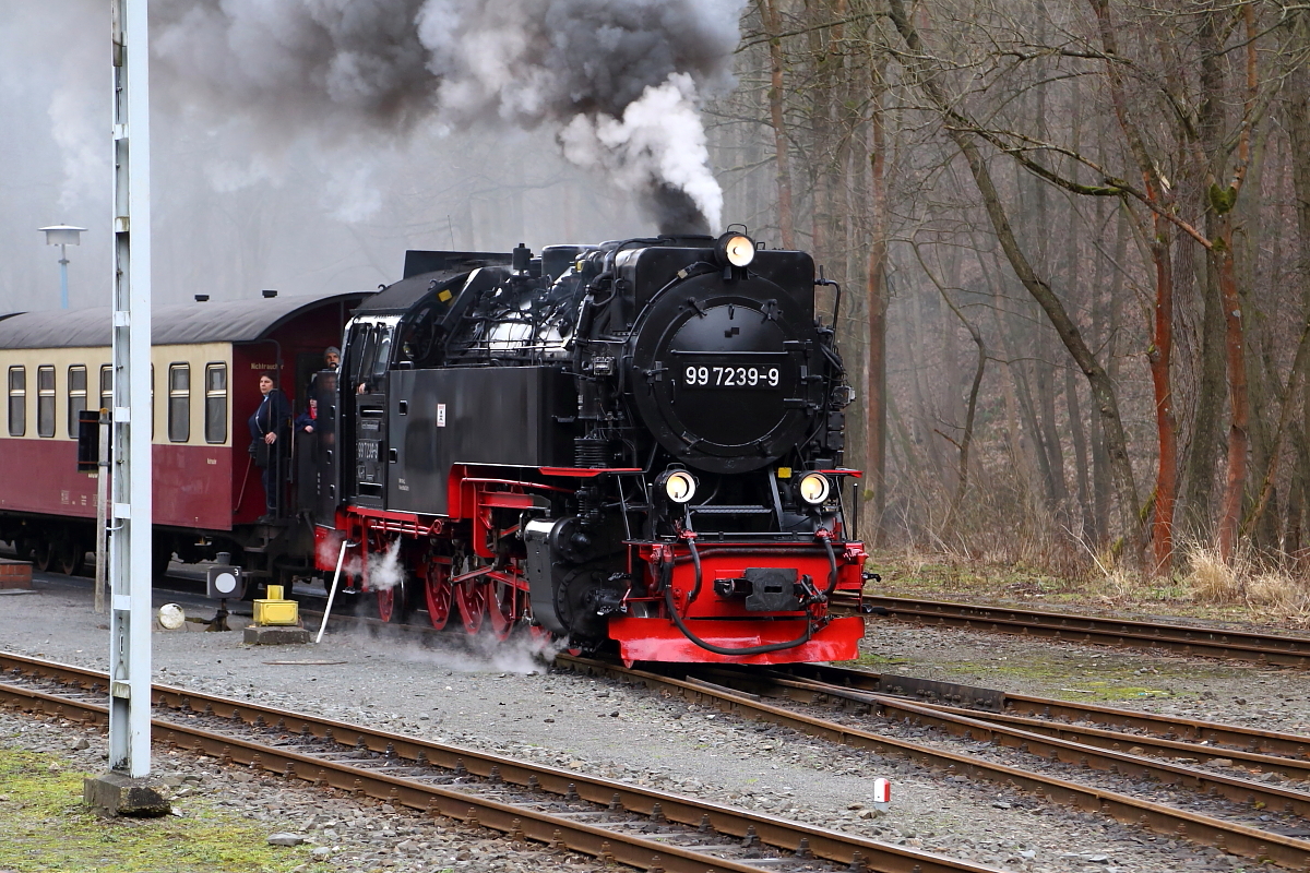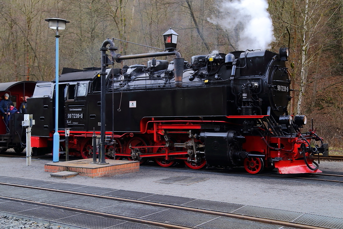 99 7239 mit P8965 (Gernrode-Hasselfelde) am 07.02.2016 abfahrbereit im Bahnhof Alexisbad. Links hinten ist ein Sonderzug der IG HSB zu sehen, welcher mit 99 5901 unterwegs nach Quedlinburg ist.