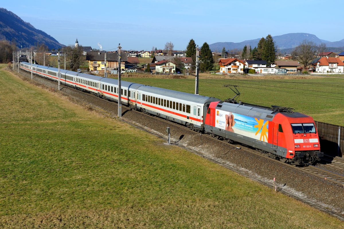 "A schiache Werbe-Hüttn" gab es dann noch in Form von 101 122 vor dem EC 217 nach Graz zu sehen, aufgenommen am 19. Dezember 2015 bei Kuchl.