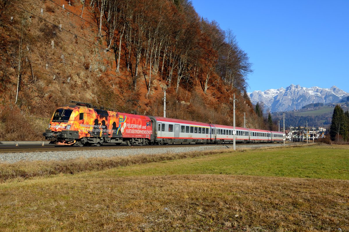 Am 20. Dezember 2015 gab sich die 1016.048 vor dem IC 542 zwischen Salzburg und Innsbruck die Ehre. Dieser Zug nimmt den längeren Weg über die Giselabahn und konnte bei Mitterberghütten aufgenommen werden. Die Natur im Salzburger Land zeigte sich am vierten Advent immer noch spätherbstlich.