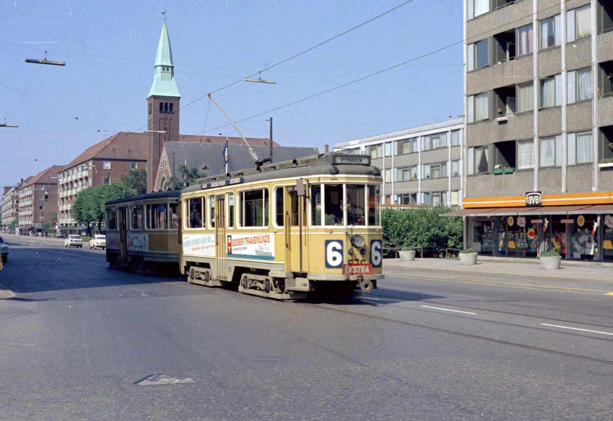 København / Kopenhagen Københavns Sporveje SL 6 (Tw 576 + Bw 15xx als E-Wagen) Østerbro, Østerbrogade / Jagtvej im Juni 1968. - Der Zug befindet sich auf der Betriebsstrecke zwischen dem Straßenbahnbetriebsbahnhof Svanemøllen und der Stammstrecke der SL 6 (Verbindungsgleis am Vibenhus Runddel). - Scan von einem Farbnegativ. Film: Kodacolor X.