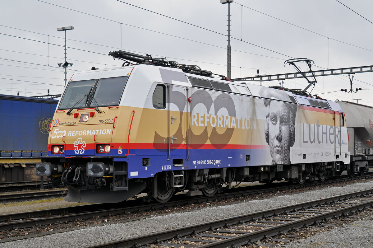 Lok 185 589-9, mit einer Werbung für die 500 Jahre Reformation von Martin Luther, durchfährt den Güterbahnhof Muttenz. Die Aufnahme stammt vom 06.02.2017.