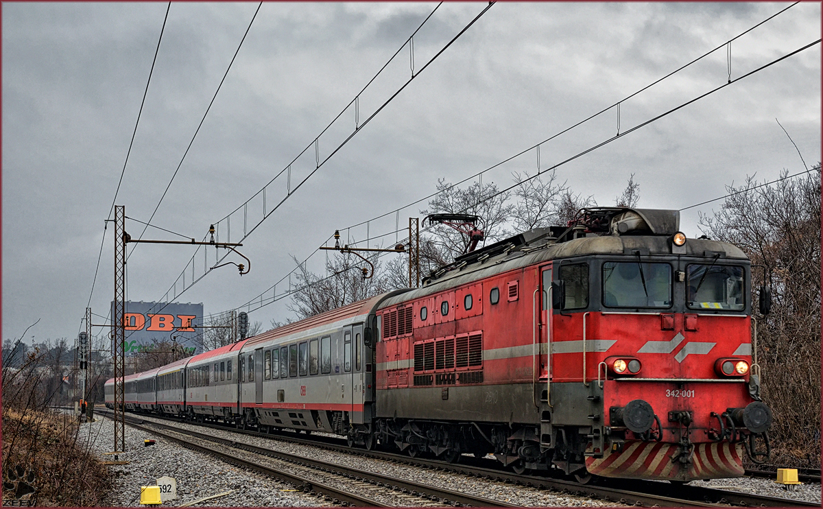 SŽ 342-001 zieht EC158 durch Maribor-Tabor Richtung Wien. /7.2.2017