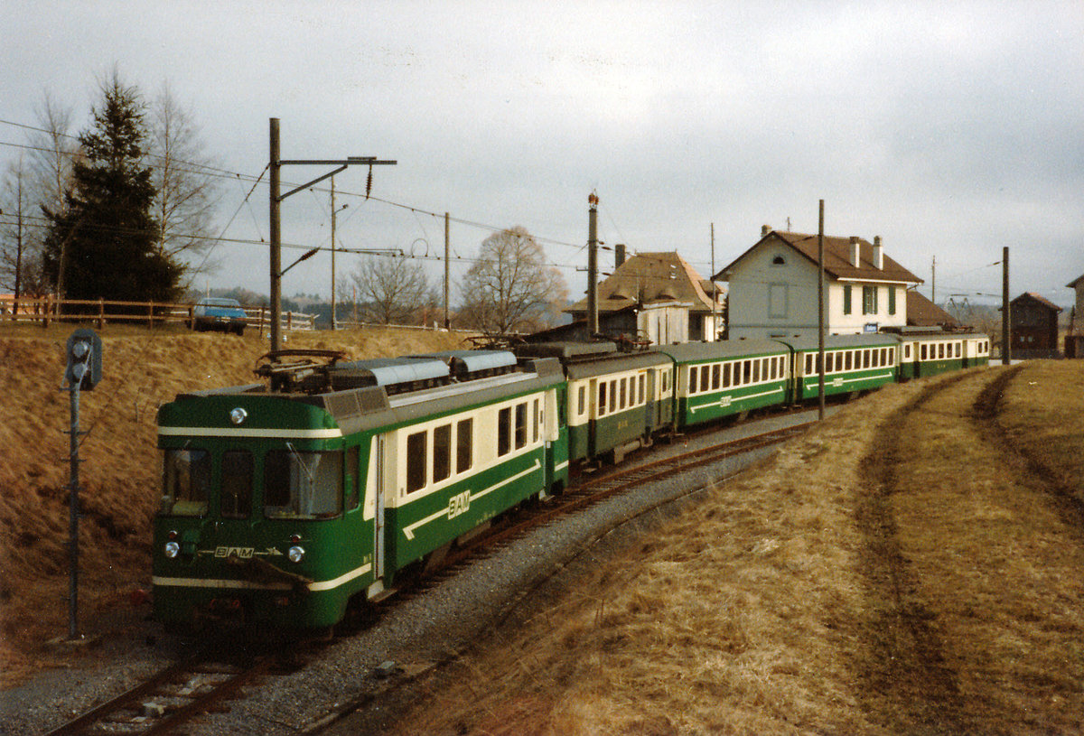 BAM: Dass dieser Zug der Bière-Apples-Morges-Bahn etwas ausserordentliches darstellt kann nur durch seine Länge erahnt werden. Am 16. Juli 1983 genossen die Rekruten die Fahrt in den Sonntagsurlaub mit dem Sonderzug, bestehend aus dreizehn Elementen. Davon fünf Motorwagen, drei Steuerwagen und fünf Wagen. Am Schluss des Zuges war der ABi 25 eingereiht. Das waren noch Zeiten, als sämtliche Rekruten in Bière an den Samstagen um 13.00h in den Sonntagsurlaub entlassen wurden. Die Aufnahme entstand bei Yens.