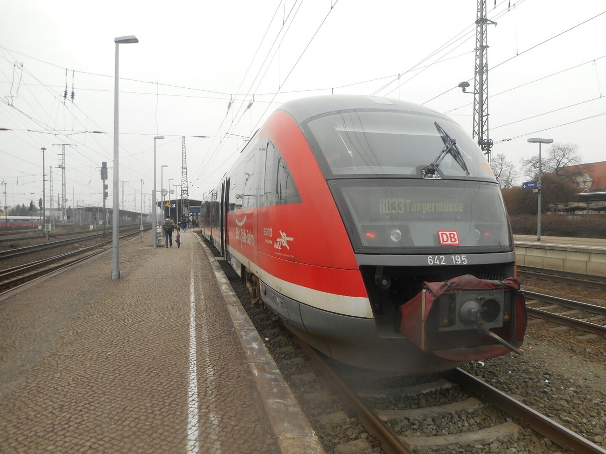 BR 642 erreicht am 09.02.2017 um 11:38 als RB aus Tangermünde den Endbahnhof Stendal.