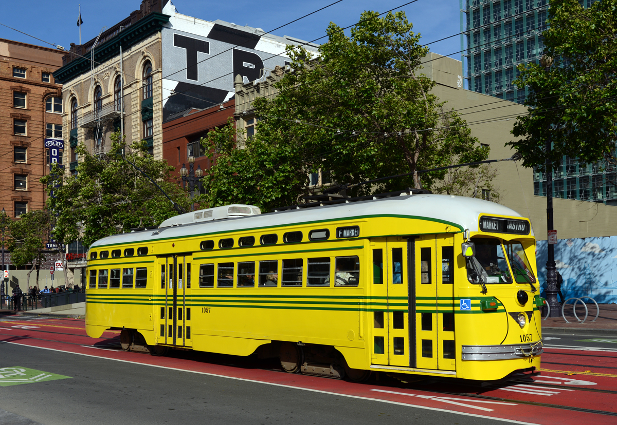 Der aus Cincinati stammenden, 1948 gebaute PCC-Wagen mit der Ordnungnummer 1057 war am Abend des 25. April 2016 nach Castro unterwegs und wurde von mir in der Market Street unweit des Civic Centers unterwegs.