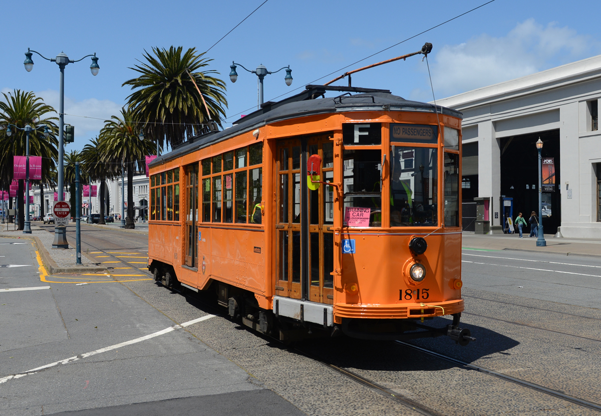 Dem Embarcadero in Richtung Castro fahrend habe ich den PCC Wagen mit der Ordnungsnummer 1070 des stillgelegte Straßenbahnnetz Newark (Public Service Coordinated Transport, Newark) am 27 April. 2016 unweit des Pier 29