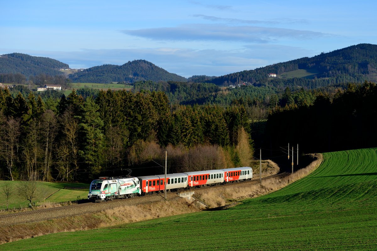 Die 1116.130 trug eine Folierung, die an das 10-jährige Jubiläum der Krankenversicherungskarte in der österreichischen Sozialversicherung erinnerte. Eigentlich sollte die Lok bereits entklebt werden, aber aufgrund hohem Arbeitsanfall in der HW Linz wurde dies auf 2016 verschoben. Am 22. Dezember 2015 bemerkte ich bei einem Blick in den ÖBB Lok-Finder, dass diese Lok mit einem R auf die Summerrauer Bahn kommen sollte. Trotz wackliger Wettervorhersagen wurde die Fahrt ins Mühlviertel gewagt. Bei Lest gelang dann erfreulicherweise diese Aufnahme des Objektes der Begierde vor dem R 3804 nach Jeske Budejovice.