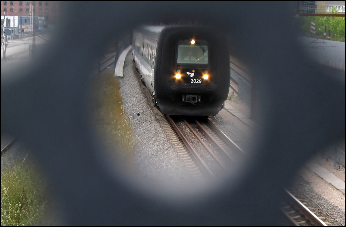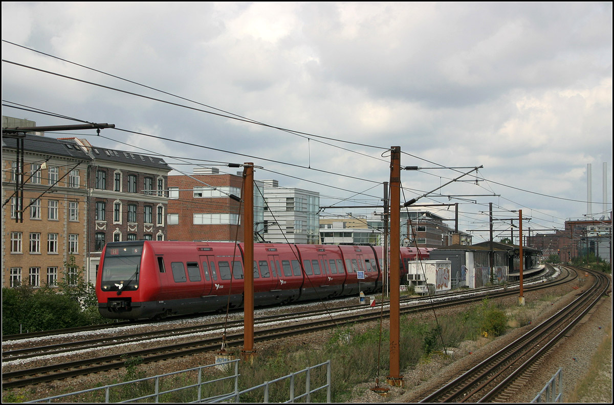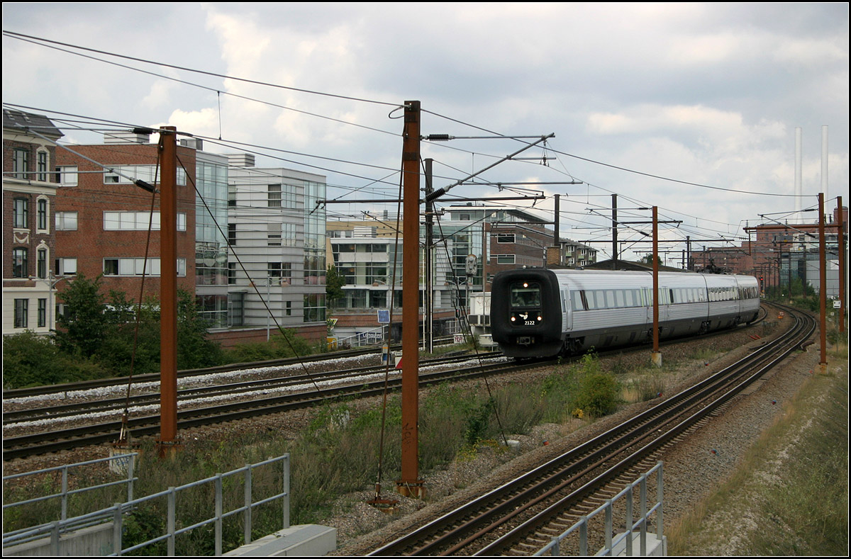 Ein IC 3-Triebzug nahe der Station Nordhavn in Kopenhagen. Blick von einer Fußgängerbrücke, die mit Lochplech-Brüstungen versehen war. Vermutlich gibt es diesen Steg heute nicht mehr.